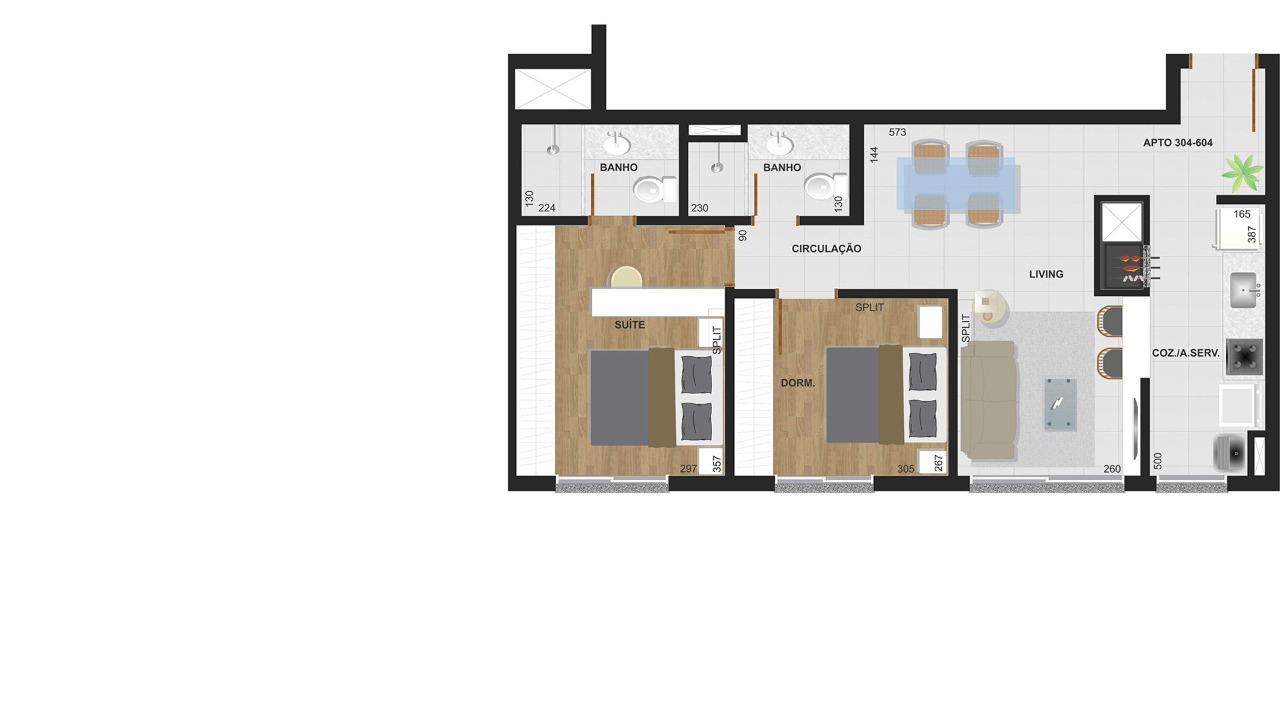Apartamento com 61,72m2 de área privativa. Possui 2 quartos, sendo 1 uma suíte, living para dois ambientes, banheiro social, cozinha com churrasqueira e área de serviço integrada. Possui 1 vaga coberta na garagem.