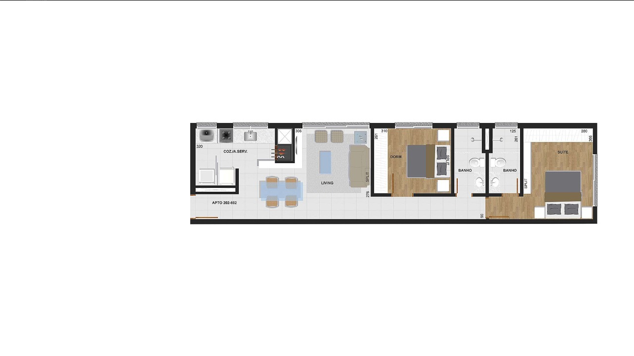Apartamento de 2 quartos com 61,72m2 de área privativa. Possui 2 quartos sendo, 1 suíte, living para dois ambientes com piso de porcelanato, banheiro social, cozinha com área de serviço e churrasqueira. Com 1 vaga coberta na garagem.