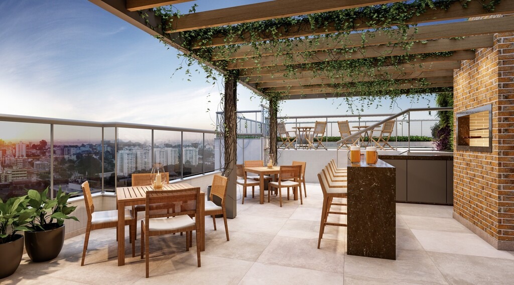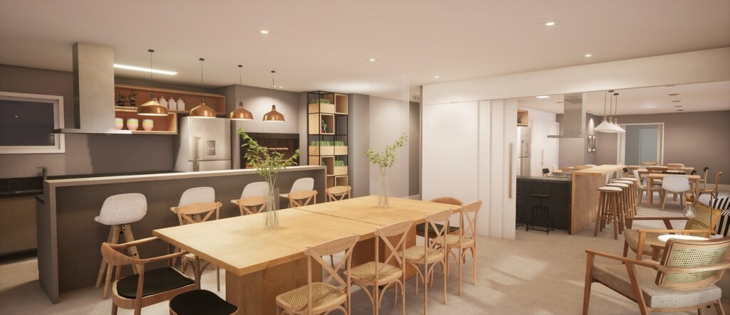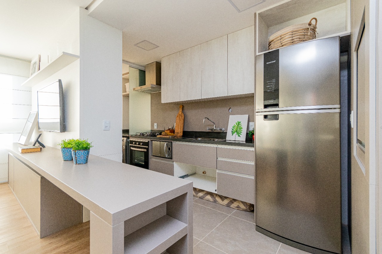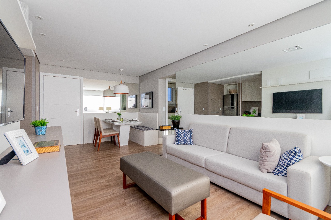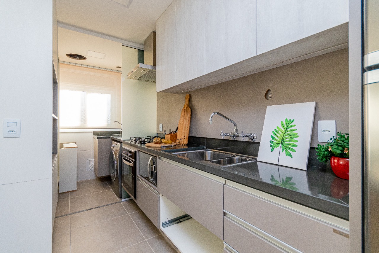 Apartamento com 90m2 de área privativa. Possui 3 quartos, sendo, um deles, 1 suíte, living para dois ambientes, banheiro social, cozinha americana com churrasqueira e área de serviço, e 2 vagas de garagem individuais com depósito.