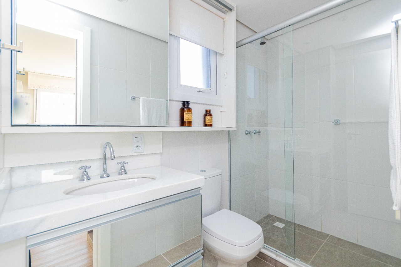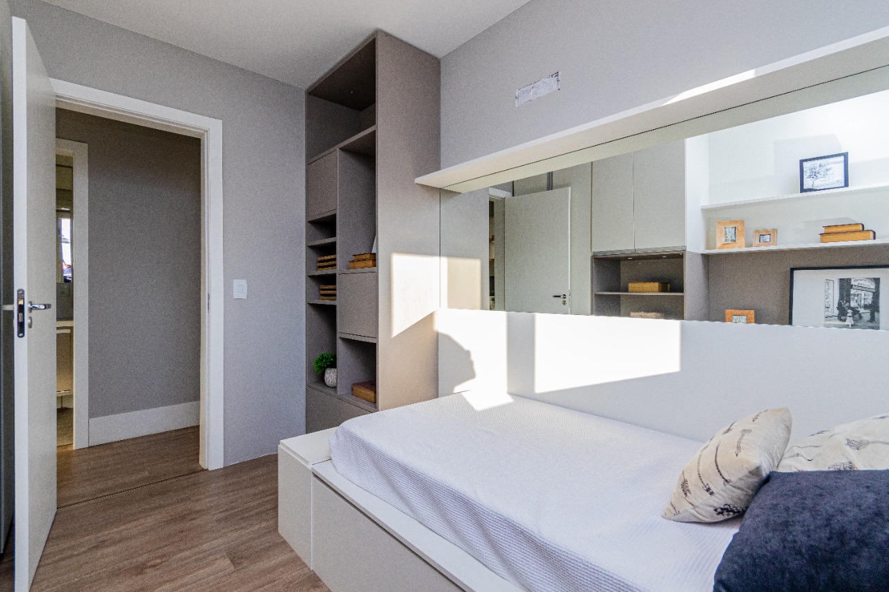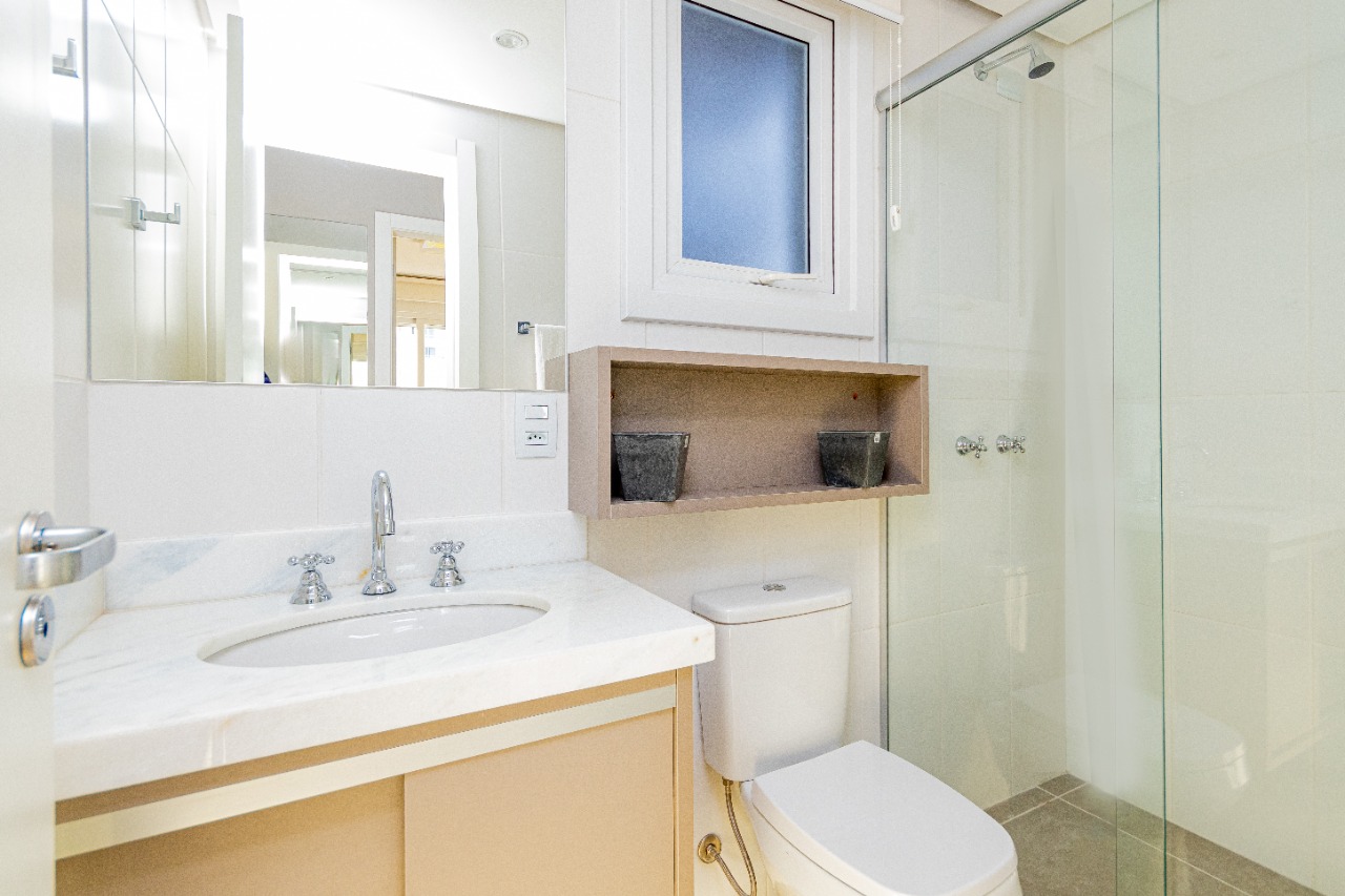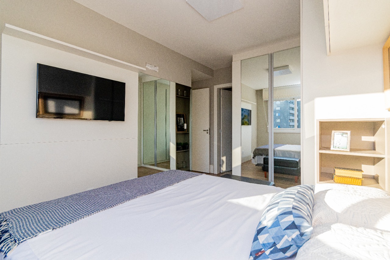 Apartamento com 90m2 de área privativa. Possui 3 quartos, sendo, um deles, 1 suíte, living para dois ambientes, banheiro social, cozinha americana com churrasqueira e área de serviço, e 2 vagas de garagem individuais com depósito.