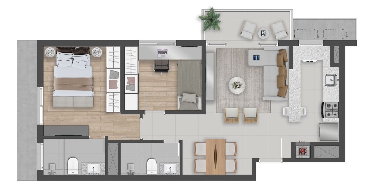 Apartamento com 66m2 de área privativa. Possui 2 quartos, sendo, uma suíte, living para dois ambientes, banheiro social, cozinha americana com churrasqueira e área de serviço integrada. Com 1 vaga na garagem.
