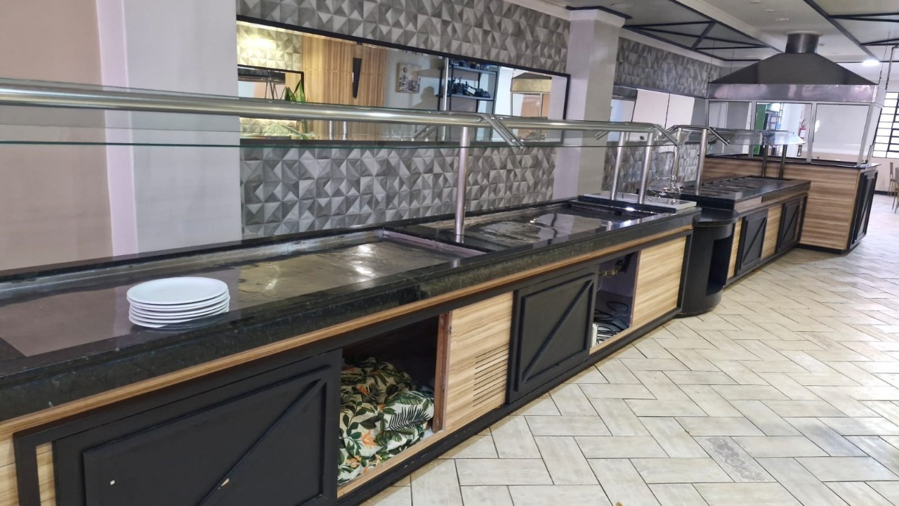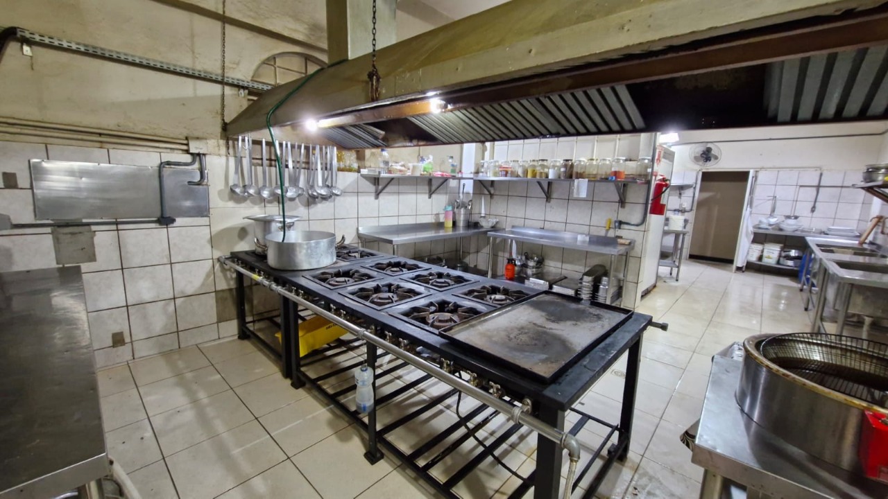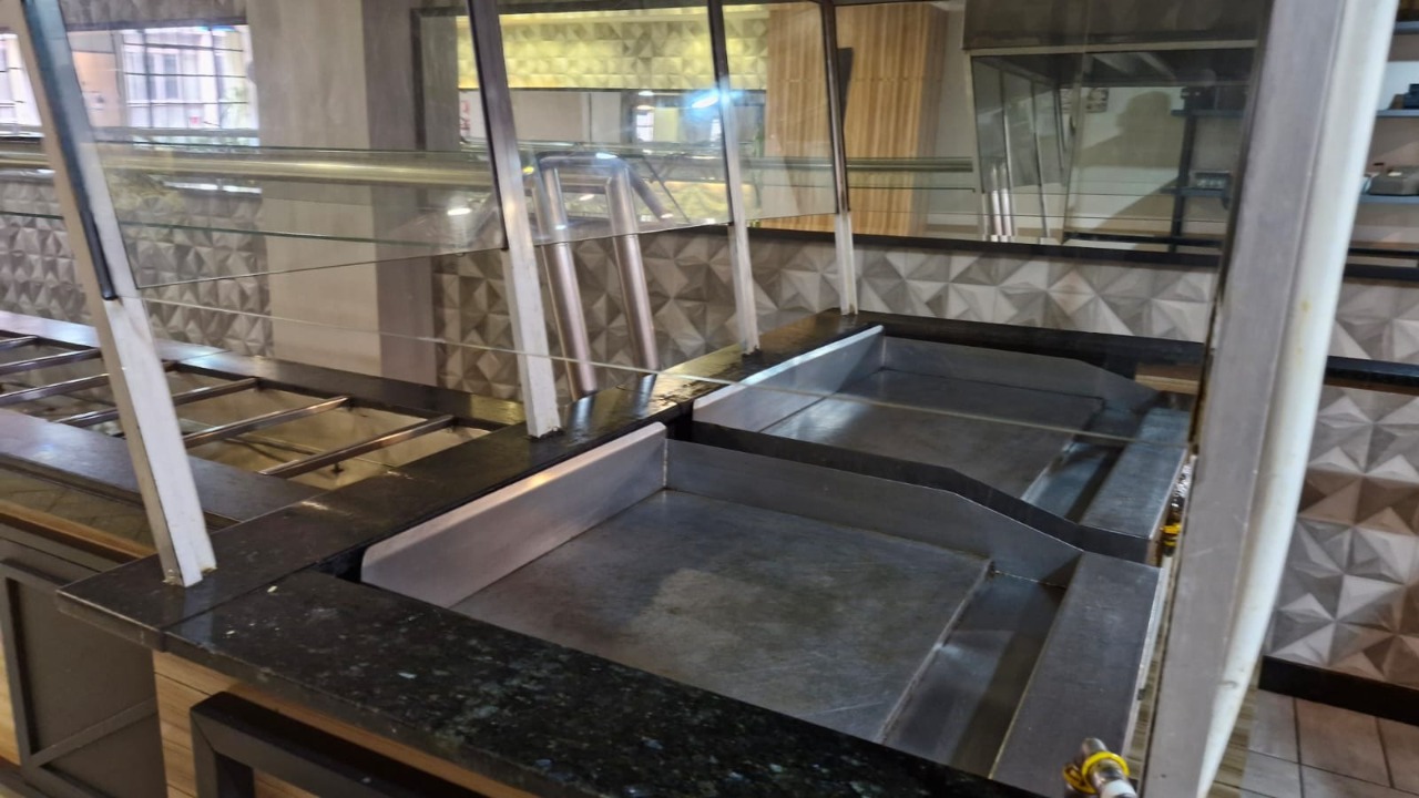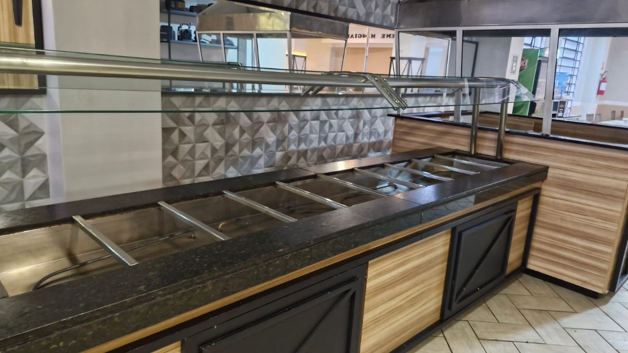 Na parte social: mesas, cadeira, pratos, cutelarias, panela elétrica, 12 metros de balcão que fica aquecendo a comida, 1 fogão por indução com 4 bocas, 2 chapas para fazer carnes grelhadas na hora com exaustor, 4 maquinas de servir sucos, mesa e sobremesa, 1 sorveteira, balcão do caixa na recepção com 2 metros de largura, escritório fechado com circuito e TV de todo restaurante, cozinha toda montada, câmera fria, geladeira, freezer, fogão industrial, panelas, cutelaria