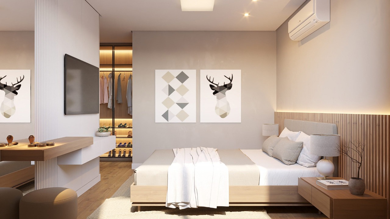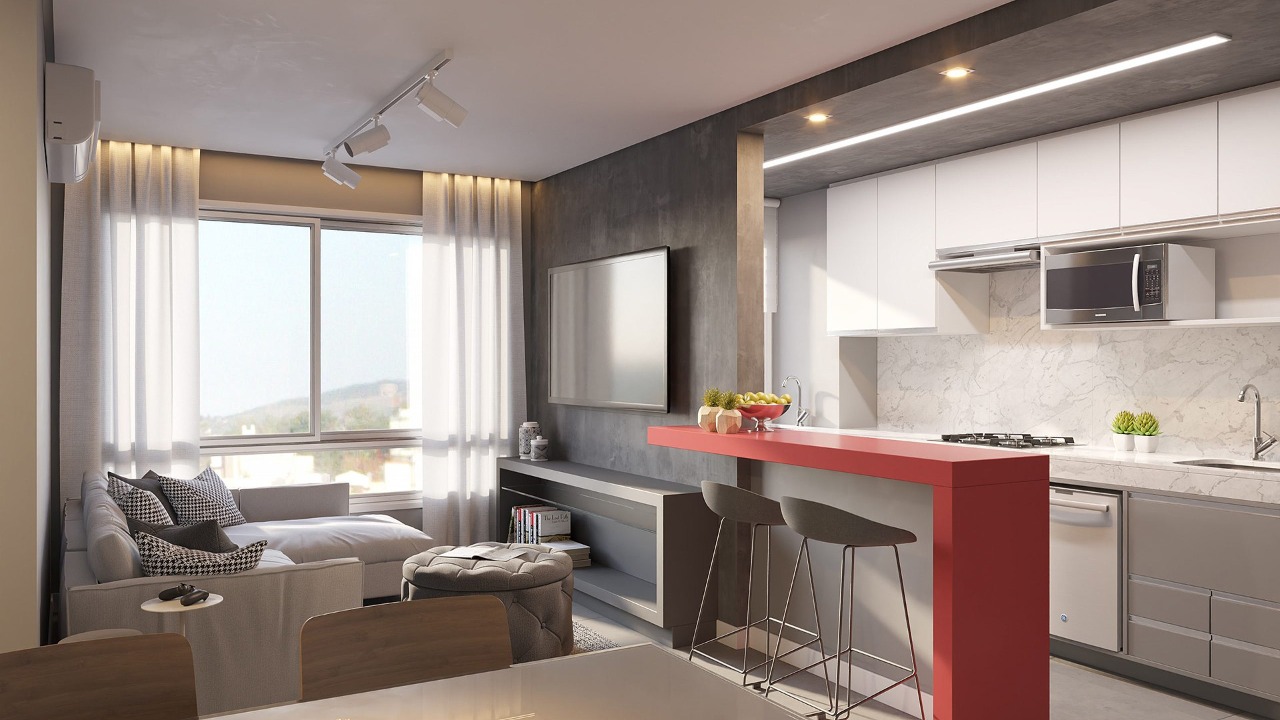 Apartamento com 61,88m2 de área privativa. Possui 2 quartos, sendo, uma suíte, sala de estar, cozinha com churrasqueira e com área de serviço integrada, banheiro auxiliar e 1 vaga individual na garagem. Conta ainda com espaço para guarda-roupa embutido na suíte e laje técnica para ar condicionado split.