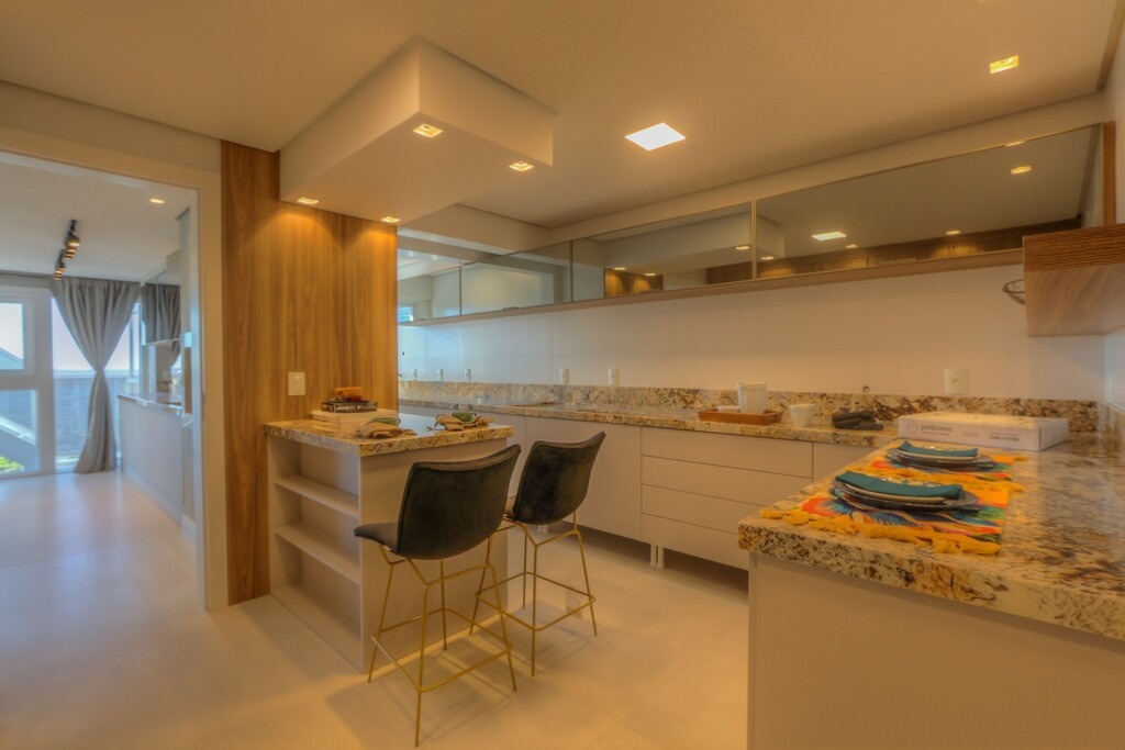 O terraço proporciona uma vista deslumbrante, ideal para relaxar e aproveitar a tranquilidade da região. A cozinha americana, equipada com churrasqueira, é o cenário perfeito para preparar refeições e receber amigos e familiares.