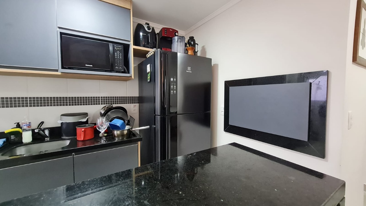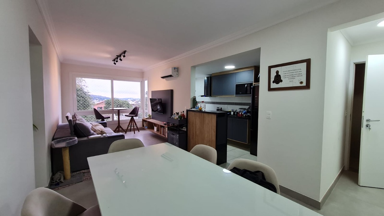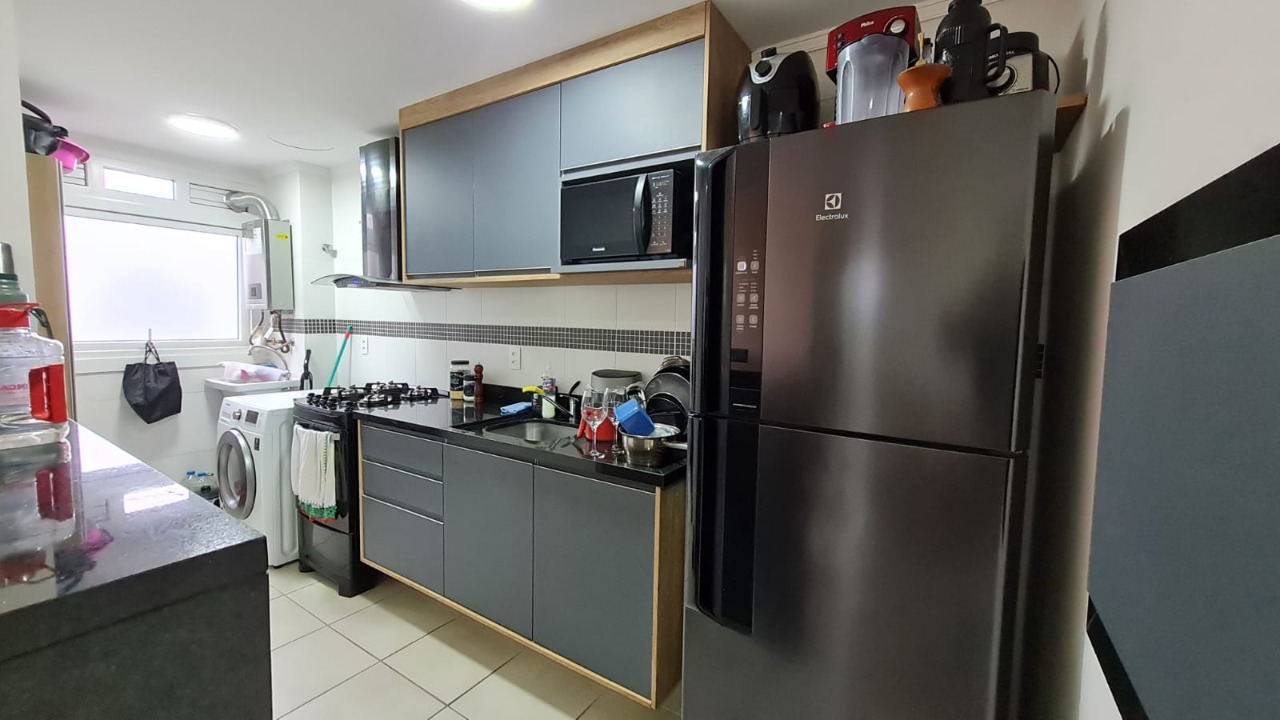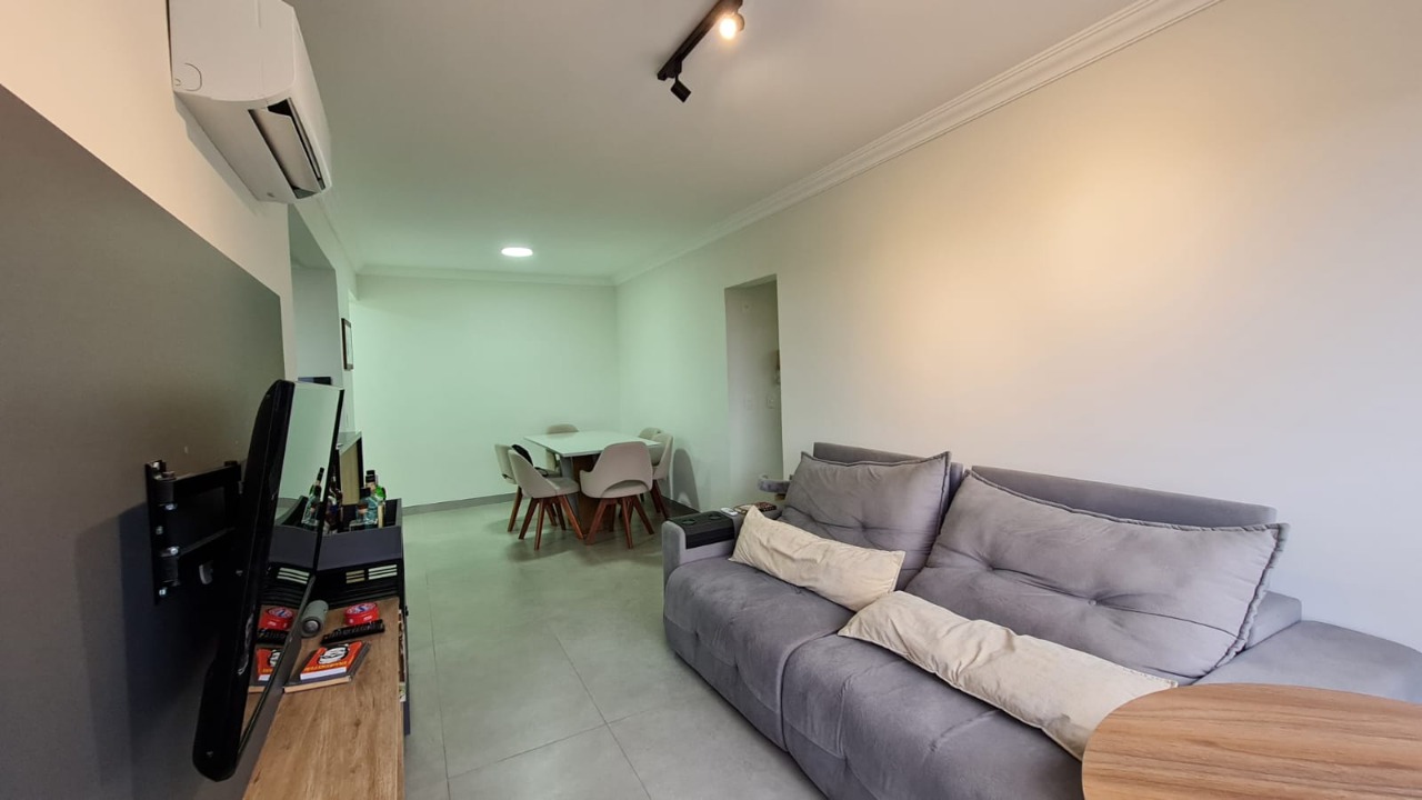 Apartamento semi mobiliado com 69m2 de área privativa. Possui 2 quartos, sendo, um deles, suíte, living para dois ambientes, banheiro social, cozinha com armários sob medida e churrasqueira, área de serviço integrada. Com 2 vagas cobertas. Ficam todos os móveis fixos.