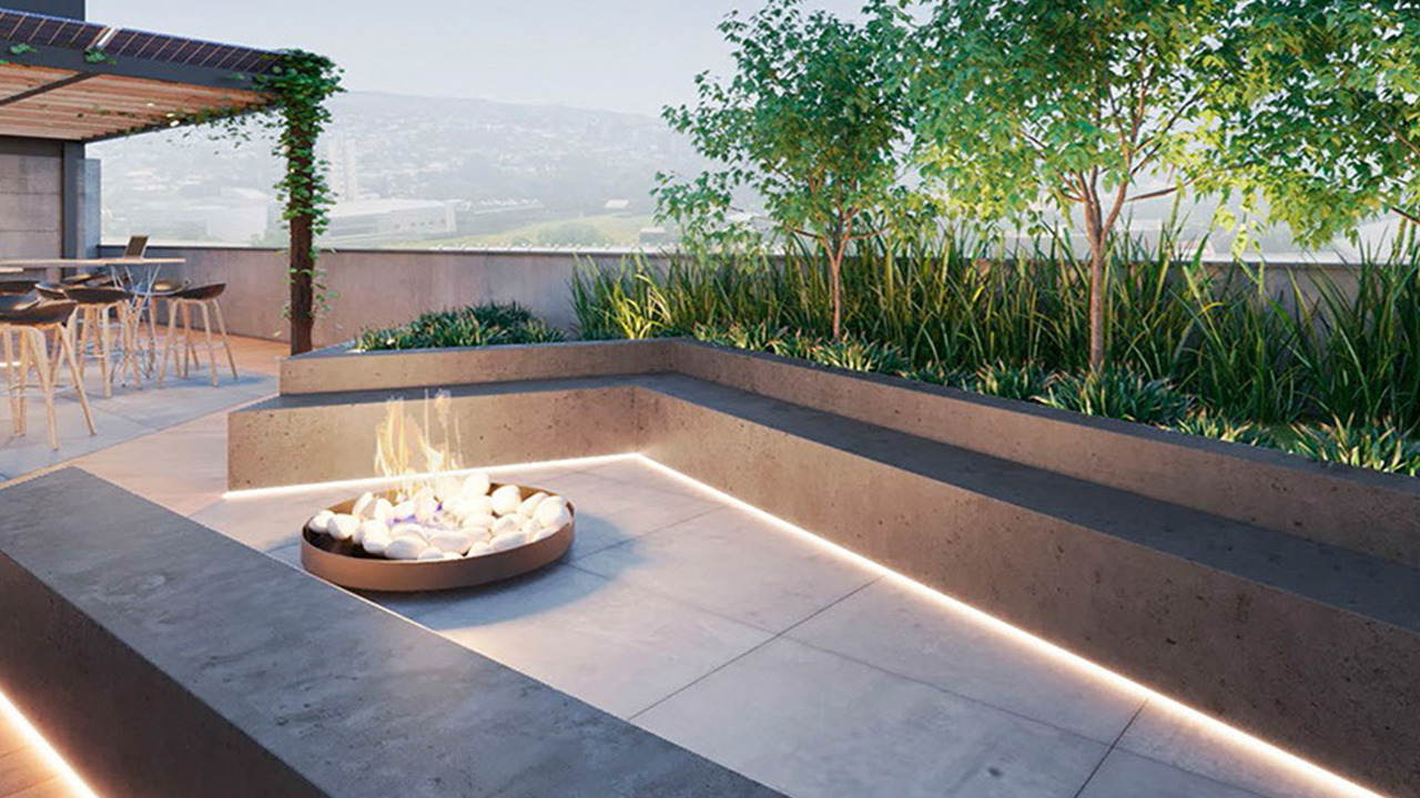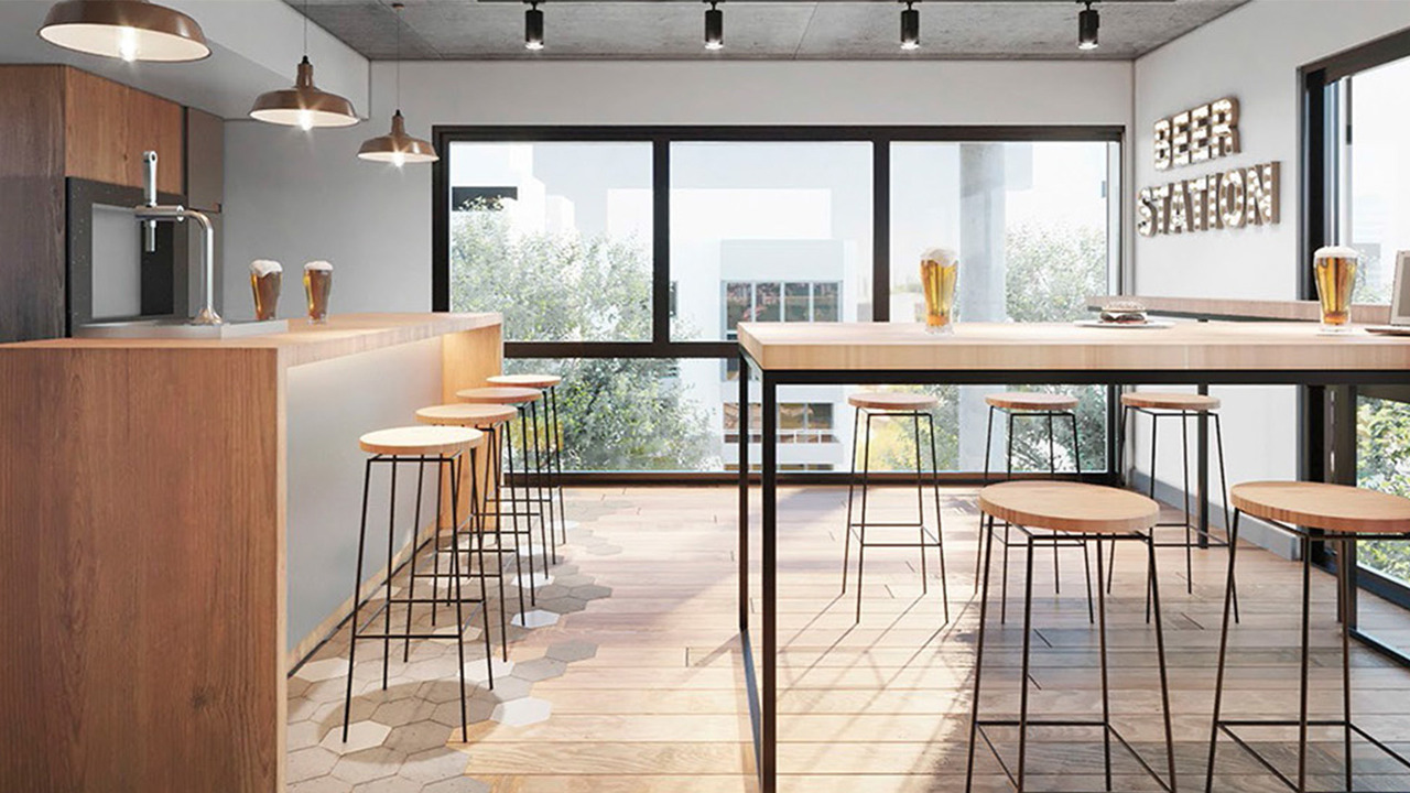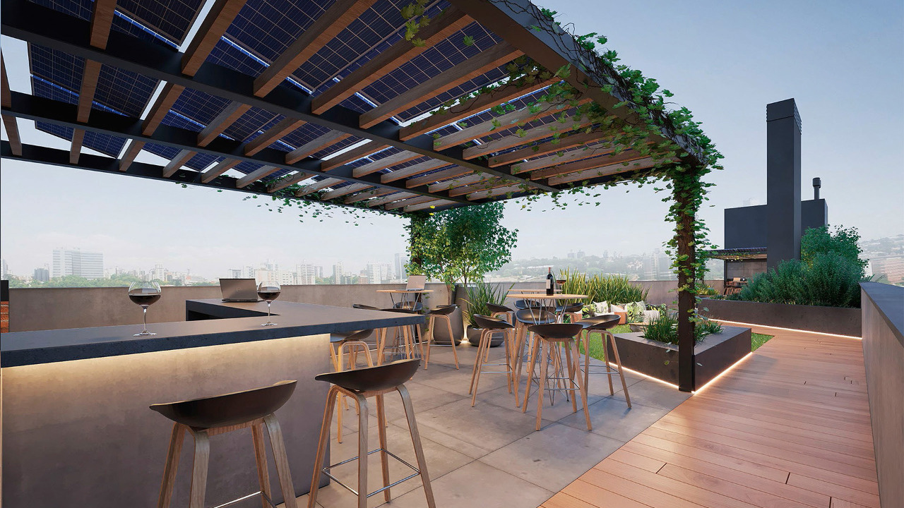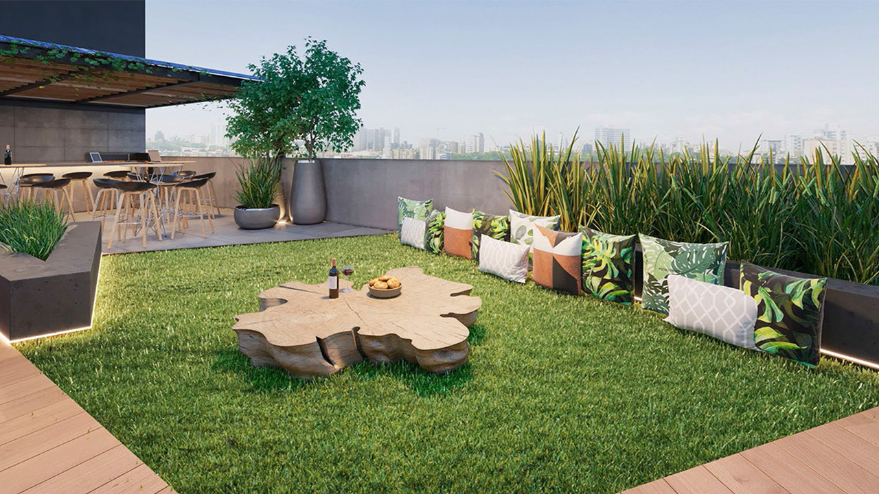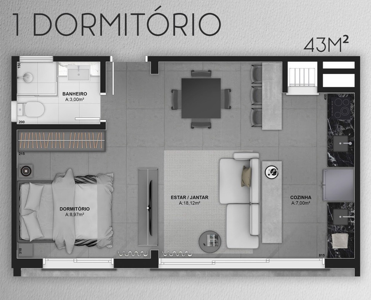 Apartamento de 1 quarto, 43m2 de área privativa, banheiro, sala de estar, cozinha americana e 1 vaga individual na garagem.