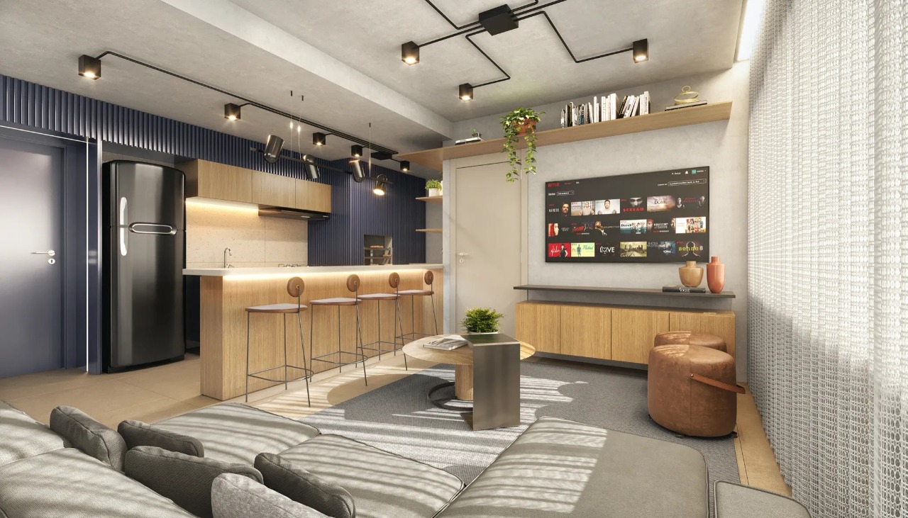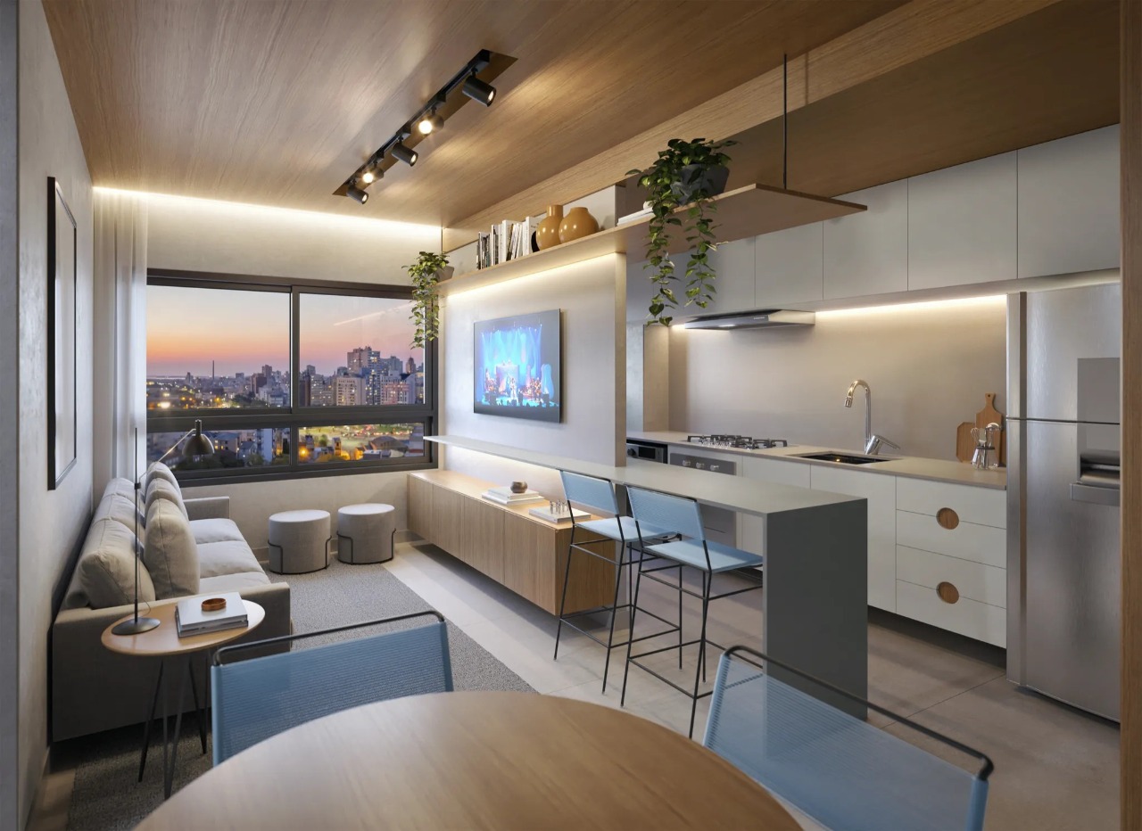 Apartamento com 60,70m2 de área privativa. Possui 2 quartos, sendo, um deles, suíte, living amplo para 2 ambientes, banheiro social, cozinha americana com churrasqueira e área de serviço integrada. Com 1 vaga na garagem.