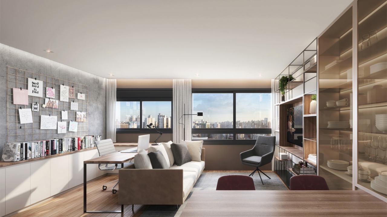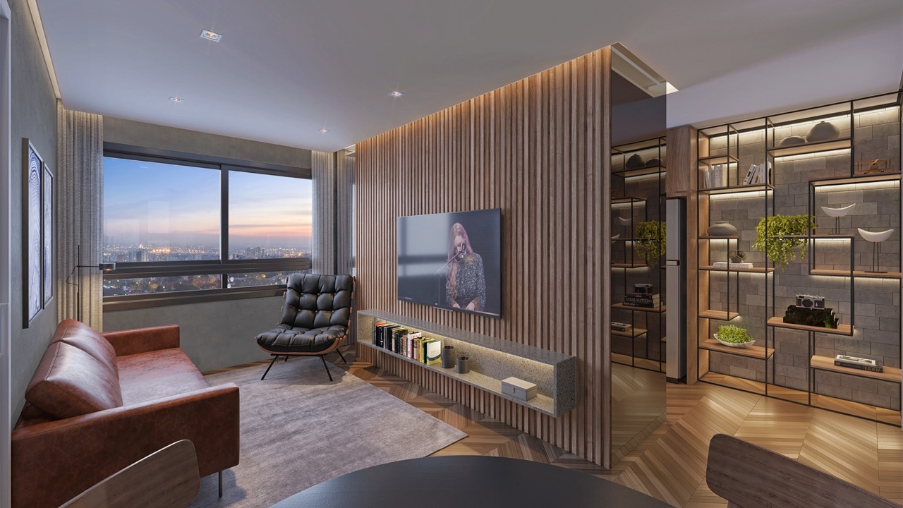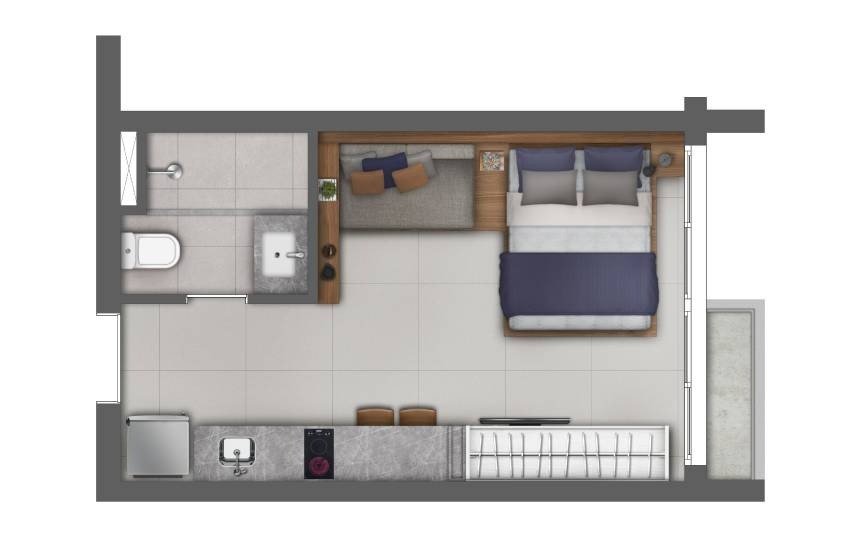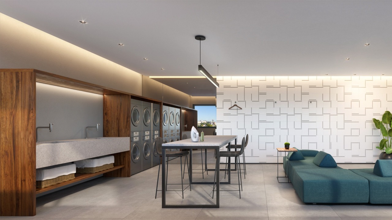 Loft de 25,53m2 de área privativa. Possui cozinha com churrasqueira integrada, espaço de estar e banheiro. Conta com laje técnica para instalação de ar condicionado e ponto para máquina de lavar roupa no banheiro.