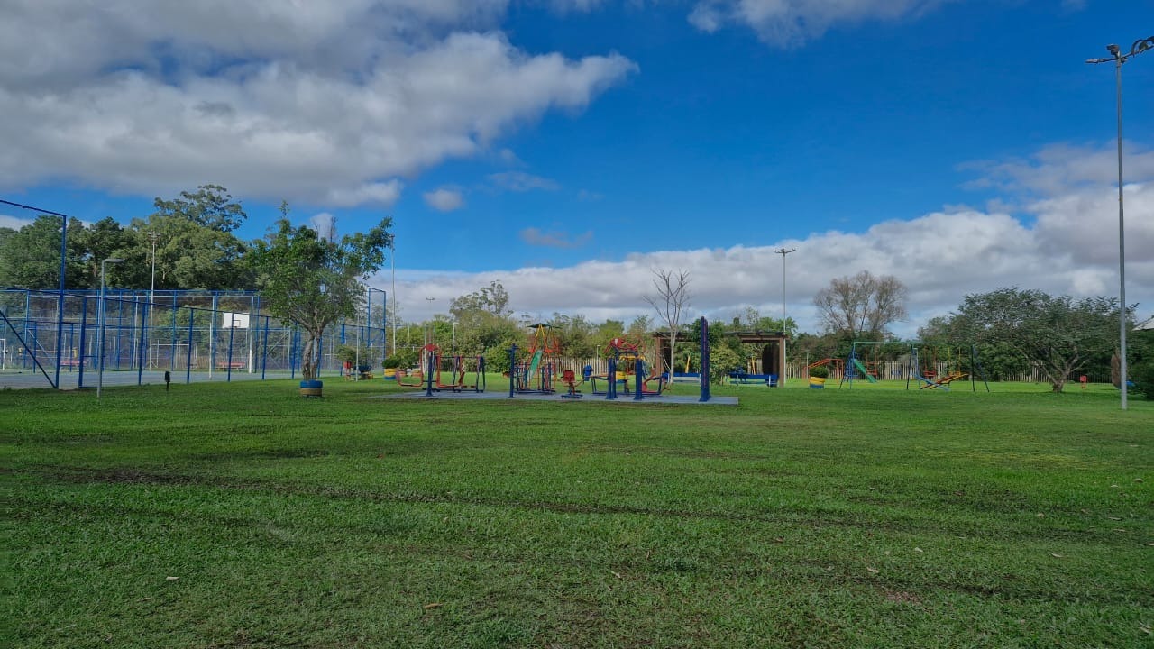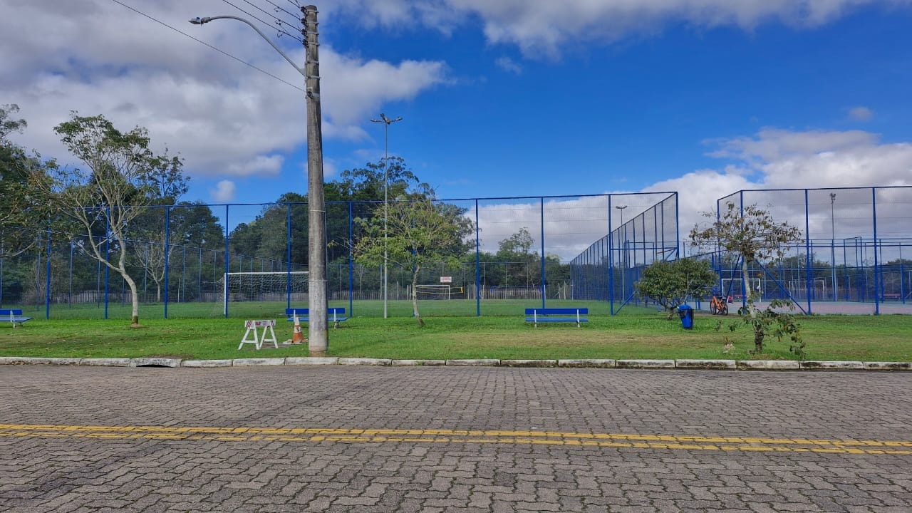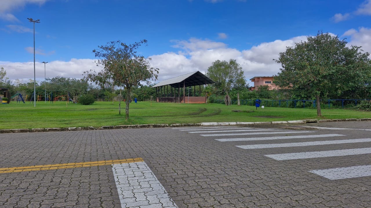 Condomínio com valor de R$ 170,00, portaria 24 horas, com 2 motos e 1 automóvel para fazer a vigilância, uma grande área de lazer com quadras de futebol de campo, salão de festas, aparelhos de exercício ao ar livre, quadra de jogar bocha coberta e ruas todas pavimentadas e bem sinalizadas.