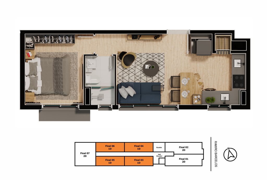 Apartamento com 35m2 de área privativa. Possui 1 quarto, living integrado, cozinha com churrasqueira e banheiro social. No dormitório, a persiana é motorizada e a esquadria com vidros duplos.