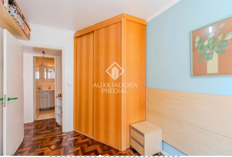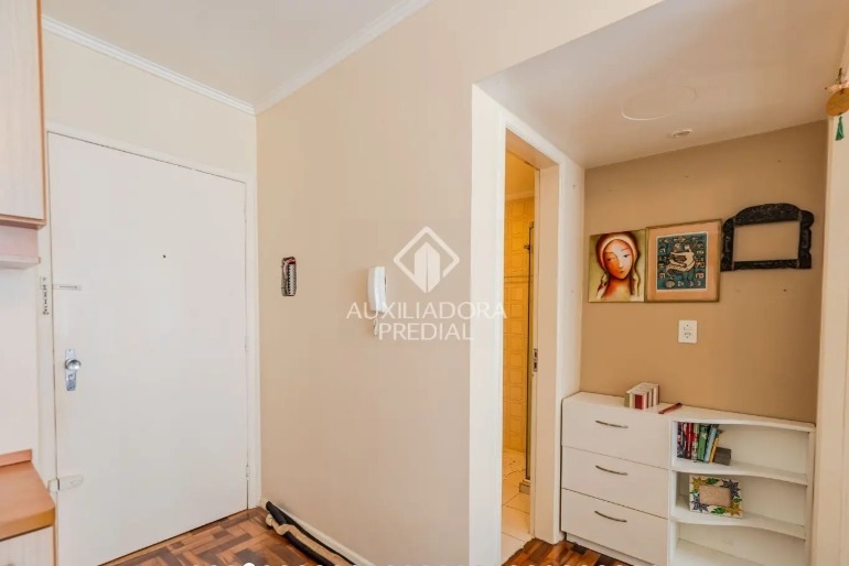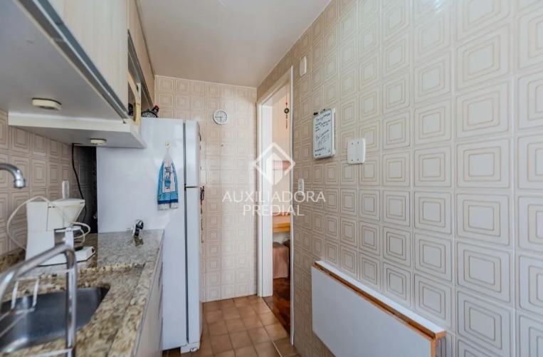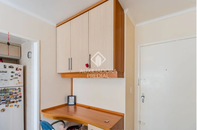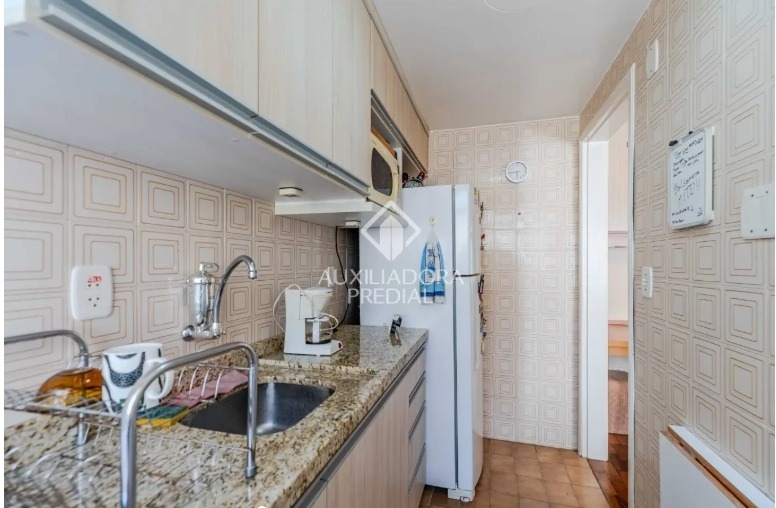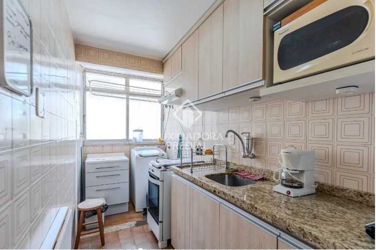 Apartamento de 1 quarto, living para 2 ambientes, banheiro social, cozinha e área de serviços separada. Está semimobiliado, ficando todos os móveis fixos feitos sob medida da cozinha, dormitório e banheiro.