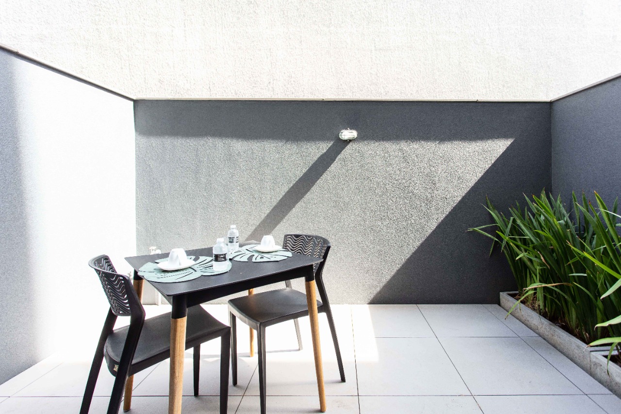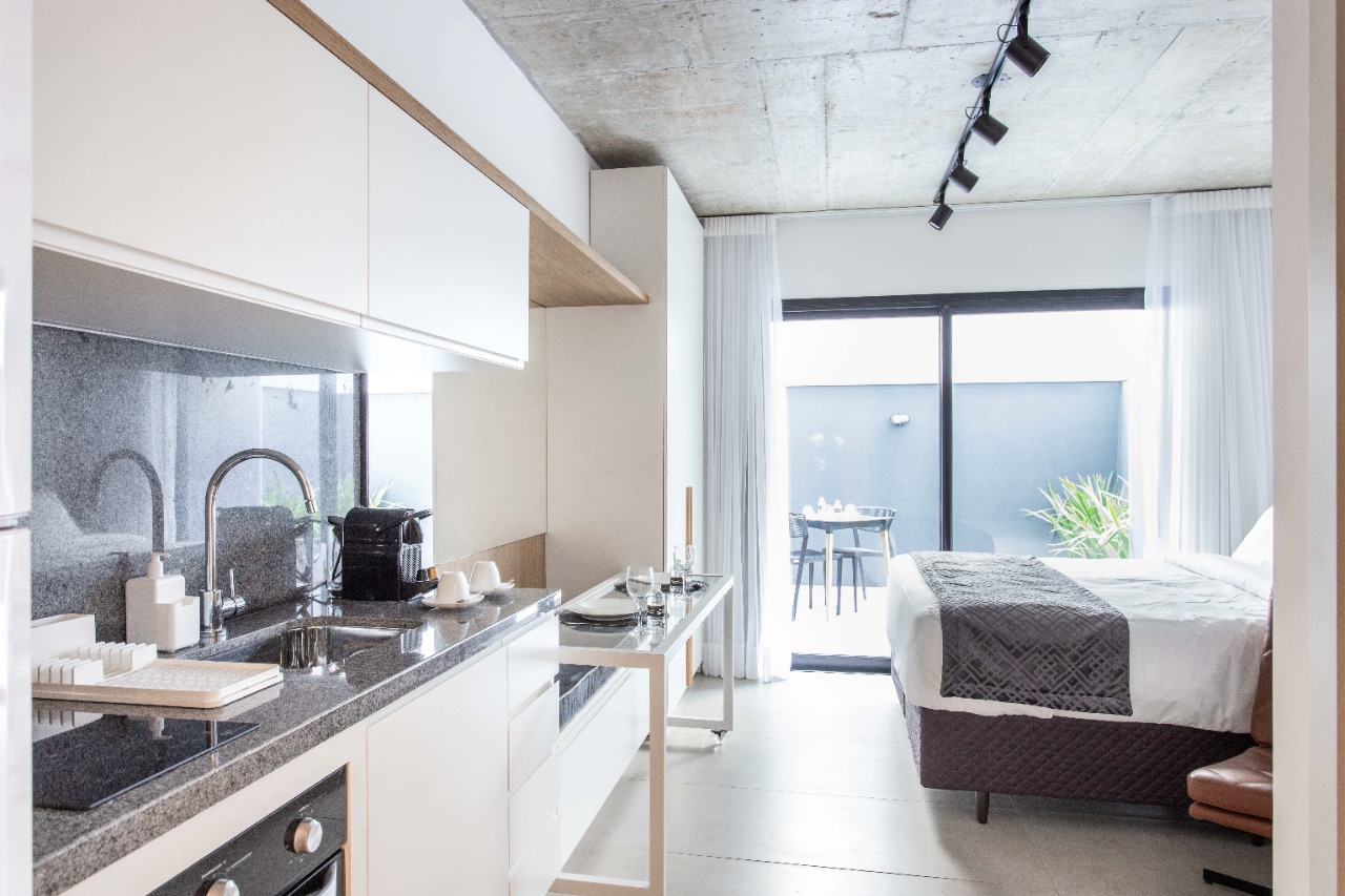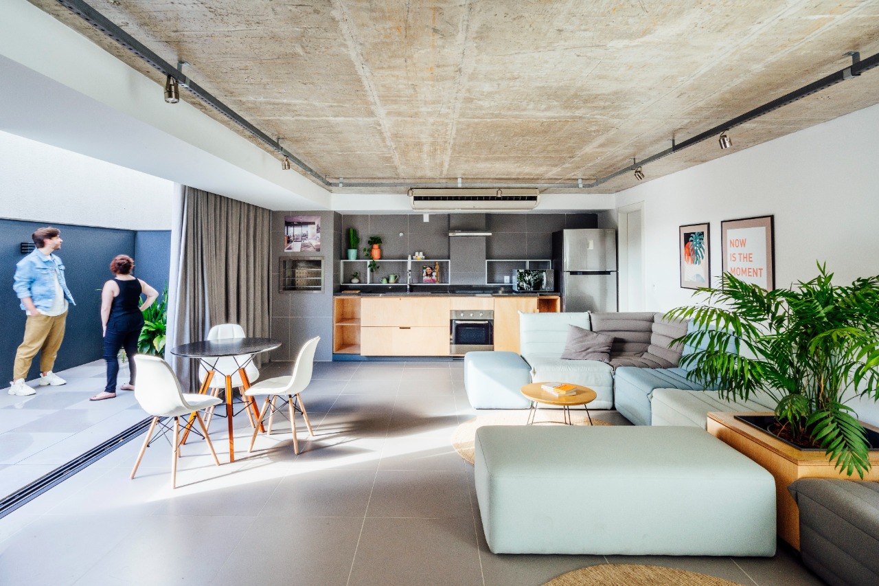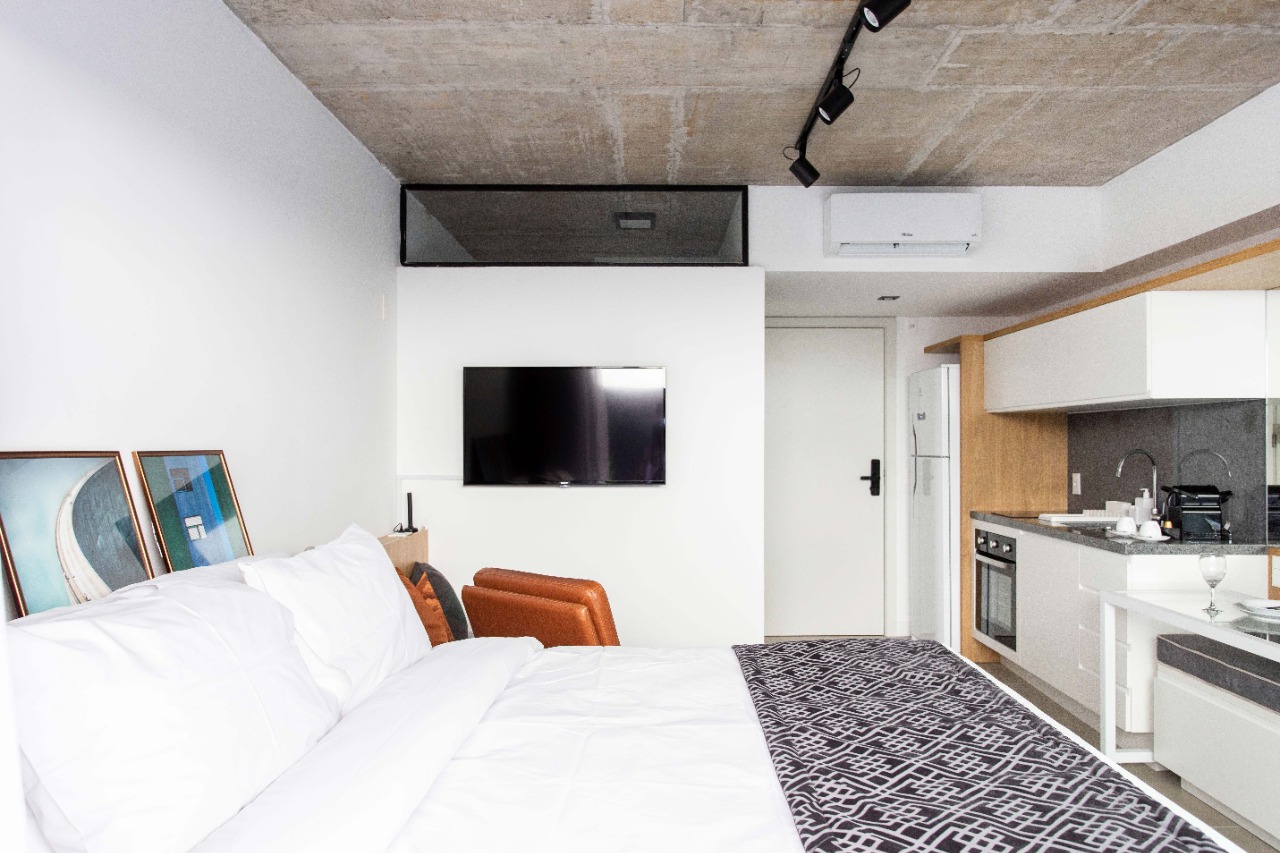 Apartamento stúdio com 36m2 de área privativa. Possui 1 quarto com sacada, cozinha americana e banheiro social.