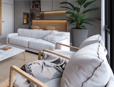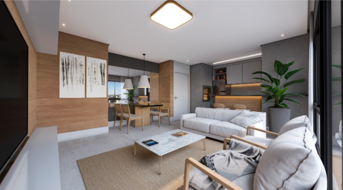 Apartamento com 66,87m2 de área privativa, 2 quartos sendo 1 suíte, cozinha americana com churrasqueira integrada, living amplo para 2 ambientes e banheiro social. Possui 1 vaga para carro.