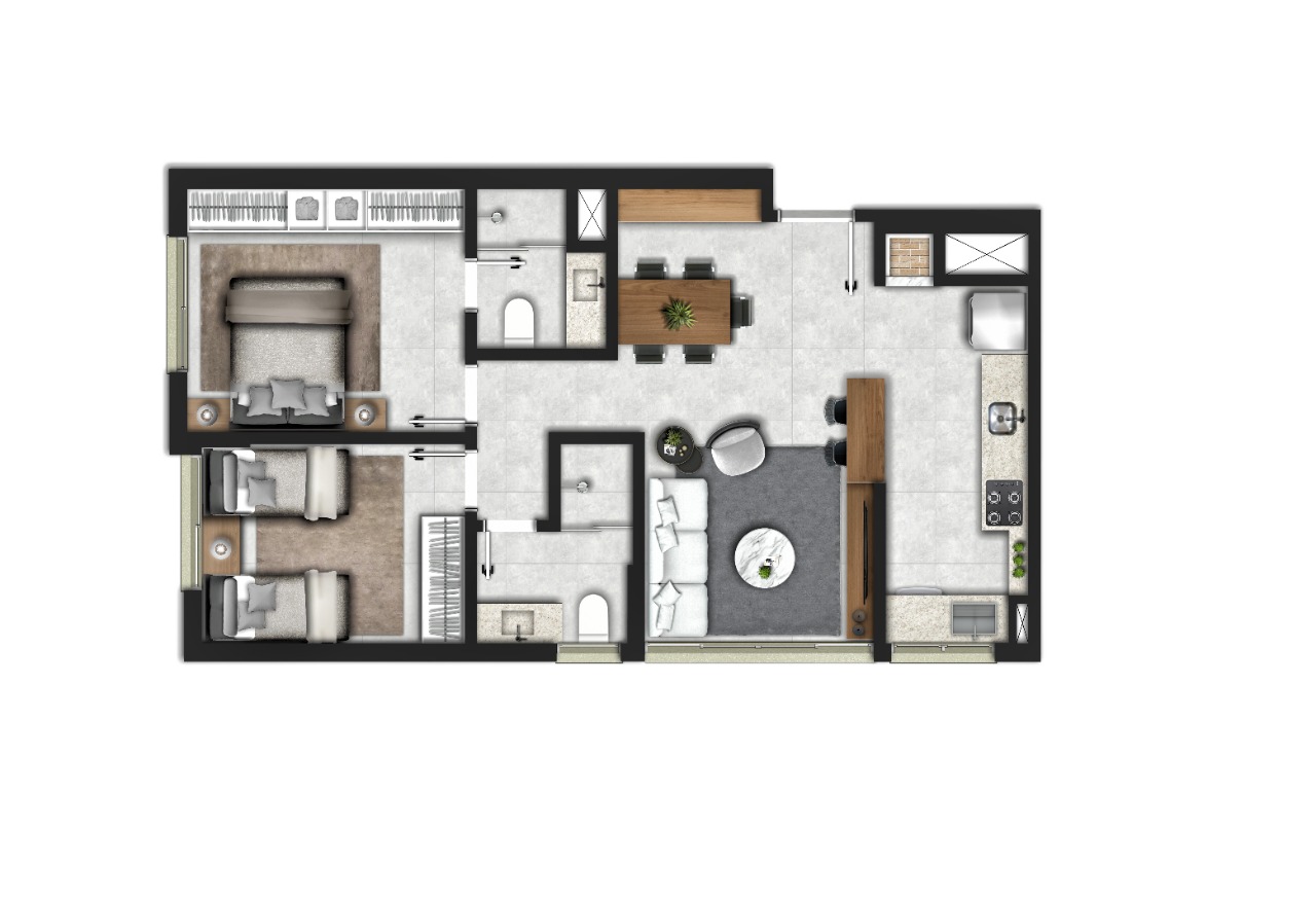 Apartamento com 62,64m2 de área privativa. Possui 2 quartos, sendo, um deles, suíte, living para 2 ambientes, banheiro social, cozinha americana com churrasqueira e área de serviço integrada. Com uma vaga coberta.