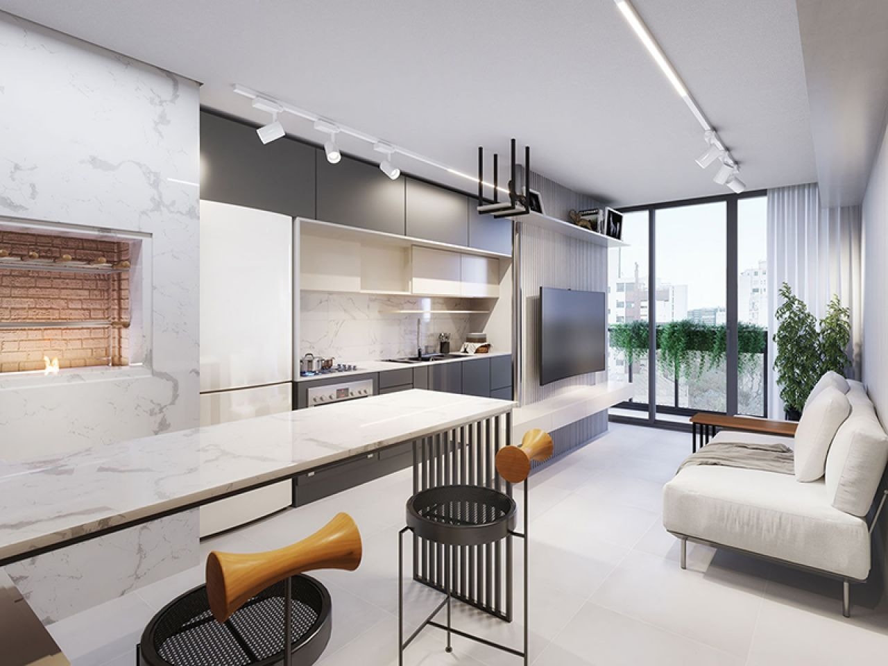 Apartamento stúdio com 41,80m2 de área privativa. Possui 1 quarto com sacada, living amblo, cozinha e banheiro social.