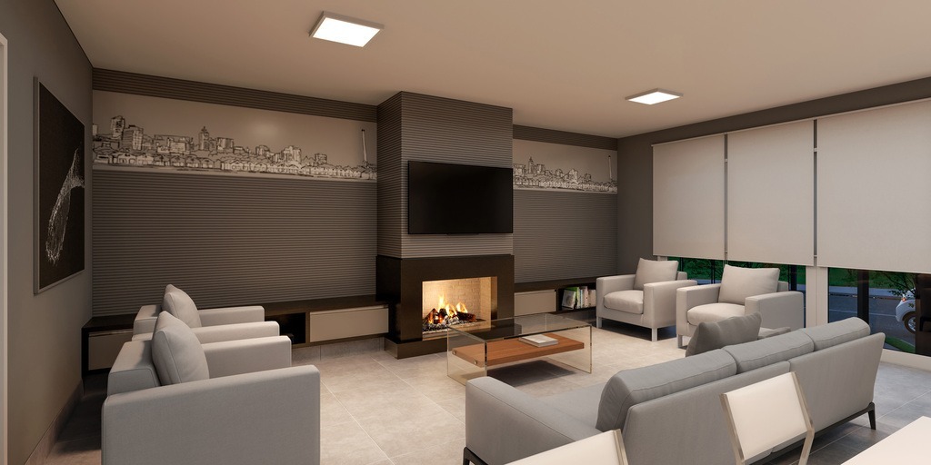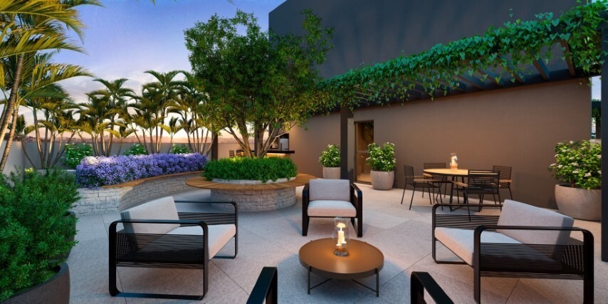 O rooftop com lounge e lareira é um espaço relaxante e acolhedor.
