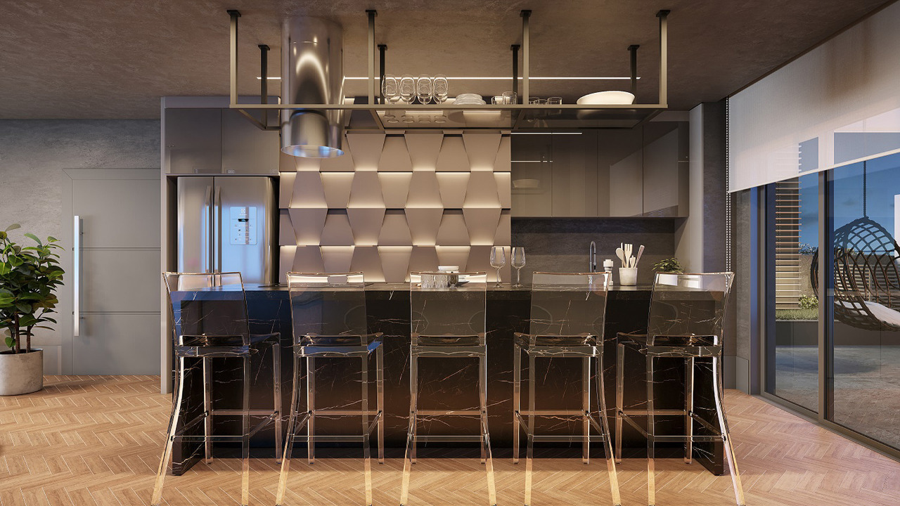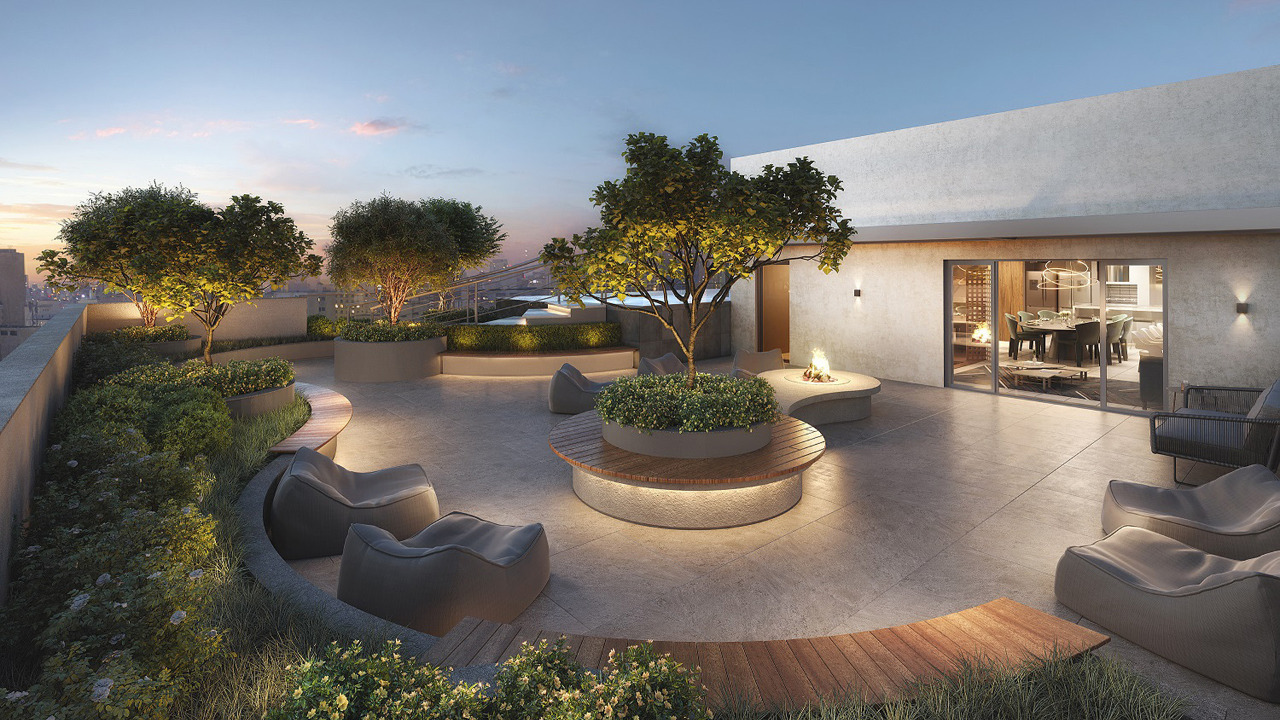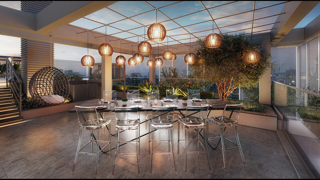 Studio com 29,09m2 de área privativa. Possui espaço para dormitório com tomadas USB, cozinha, 1 banheiro auxiliar e laje técnica para ar condicionado.