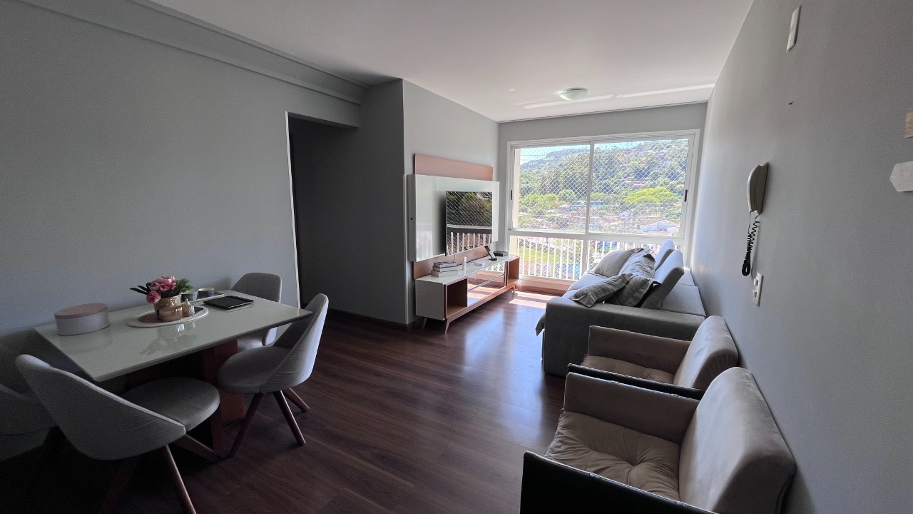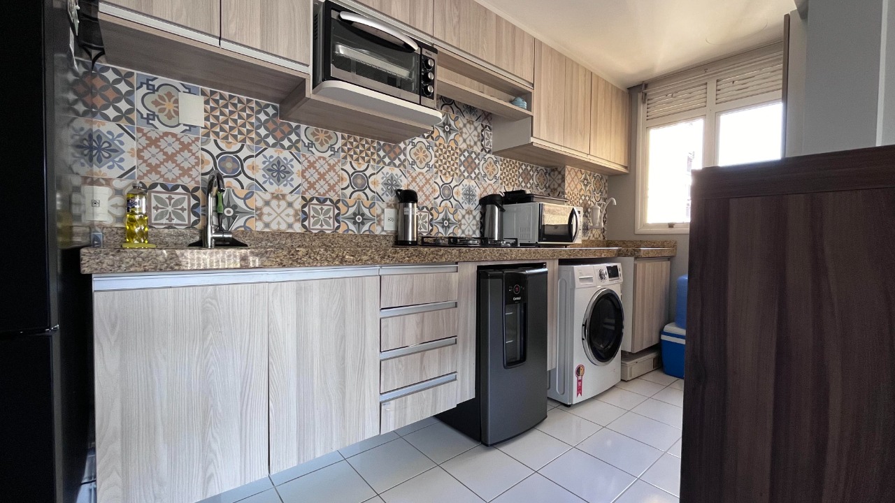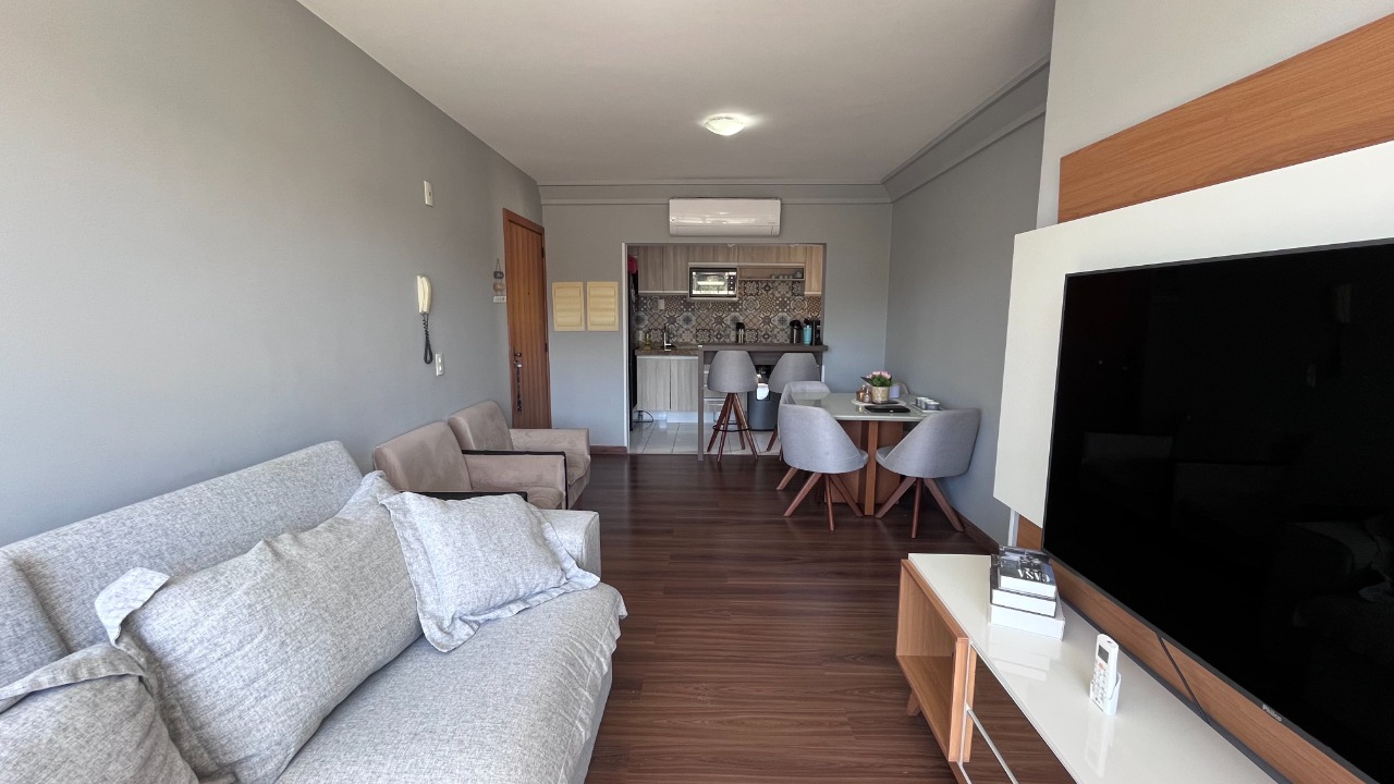 Apartamento semimobiliado com 70m2 de área privativa. Possui 3 quartos, sendo, 1 suíte, living para dois ambientes, cozinha americana com área de serviço integrada. Possui 1 vaga na garagem. Ficam os móveis fixos.