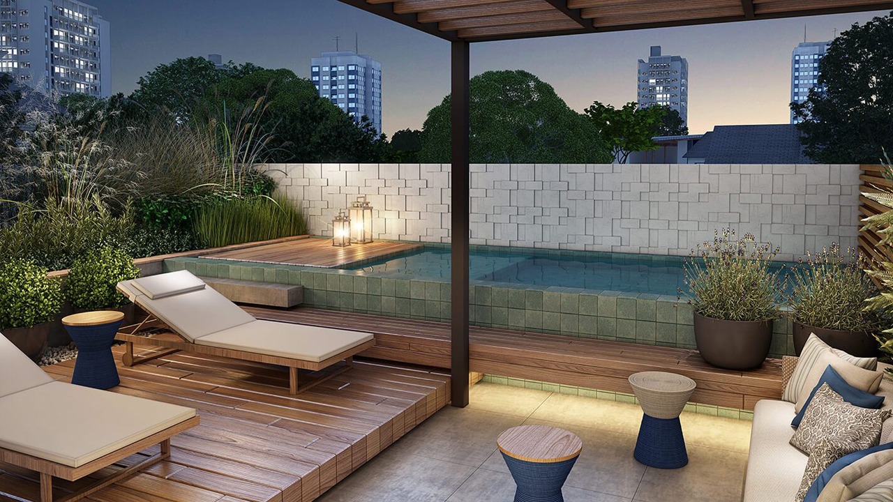 Apartamento com 2 quartos com 73,38m2 de área privativa. Possui 2 quartos sendo 1 uma suíte, sala de estar, cozinha com churrasqueira e área de serviço, 01 banheiro auxiliar e sacada com deck externo e piscina privativa. Possui vaga para 2 carros e depósito.