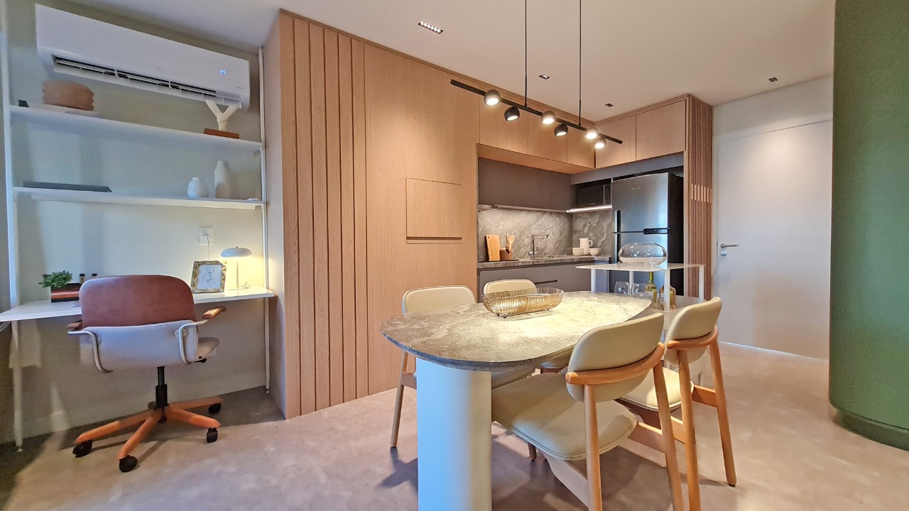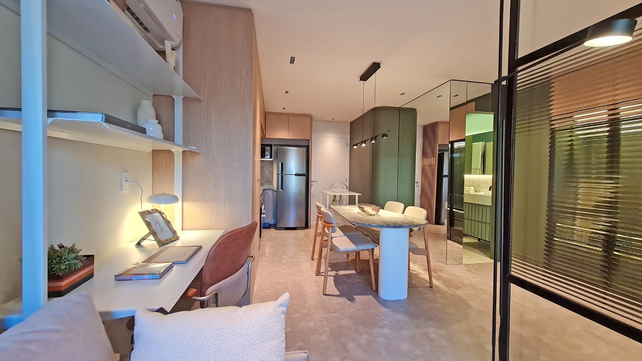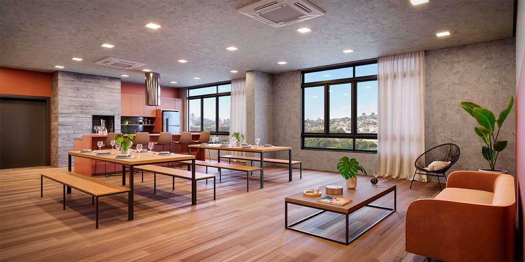 Studio com 44,65m2 de área privativa. Possui 1 quarto, living integrado com a cozinha, churrasqueira e banheiro social. Possui 1 vaga de garagem simples.